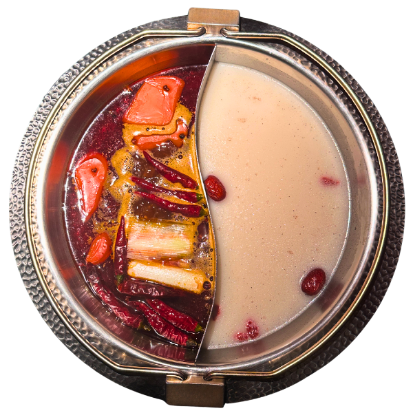 White Broth Side: Simmered with old hen in Qingcheng Mountain ancient well spring water, Chengduâtossed with dates from the thousand-year Qiang Village of Maoxian + Hanyuan tribute peppercorn for umami. So fresh youâll almost swallow your tongue; itâs the “savior fairy soup” when the spice hits hard!
