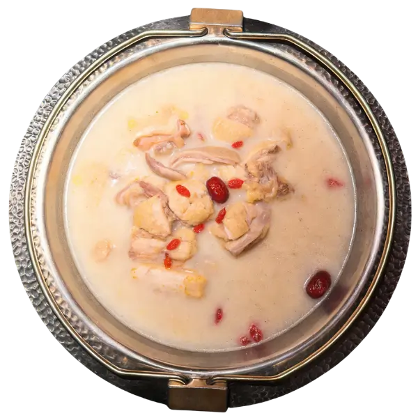White Broth Side: Simmered with old hen in Qingcheng Mountain ancient well spring water, Chengdu—tossed with dates from the thousand-year Qiang Village of Maoxian + Hanyuan tribute peppercorn for umami. So fresh you’ll almost swallow your tongue; it’s the “savior fairy soup” when the spice hits hard!